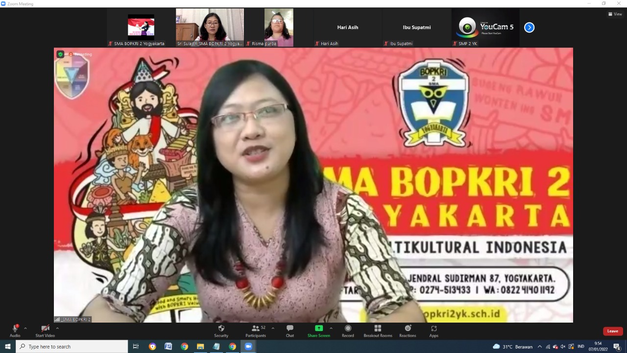 Memasuki pembelajaran awal semester genap Tahun Ajaran 2021/2022, Kepala SMA BOPKRI 2 Yogyakarta, Dr. Sri Sulastri, M.Pd. mengadakan pertemuan orang tua/wali siswa kelas X, XI dan XII secara virtual melalui zoom meeting pada Kamis, 6 Januari, Jumat 7 Januari dan Senin, 10 Januari 2022, pukul 09.00 - 10.00 WIB, dengan agenda Sosialisasi Program Sekolah dan Persiapan Pembelajaran Tatap Muka Terbatas 100 Persen.